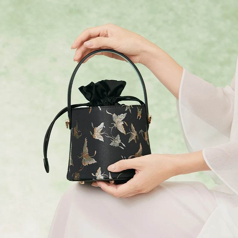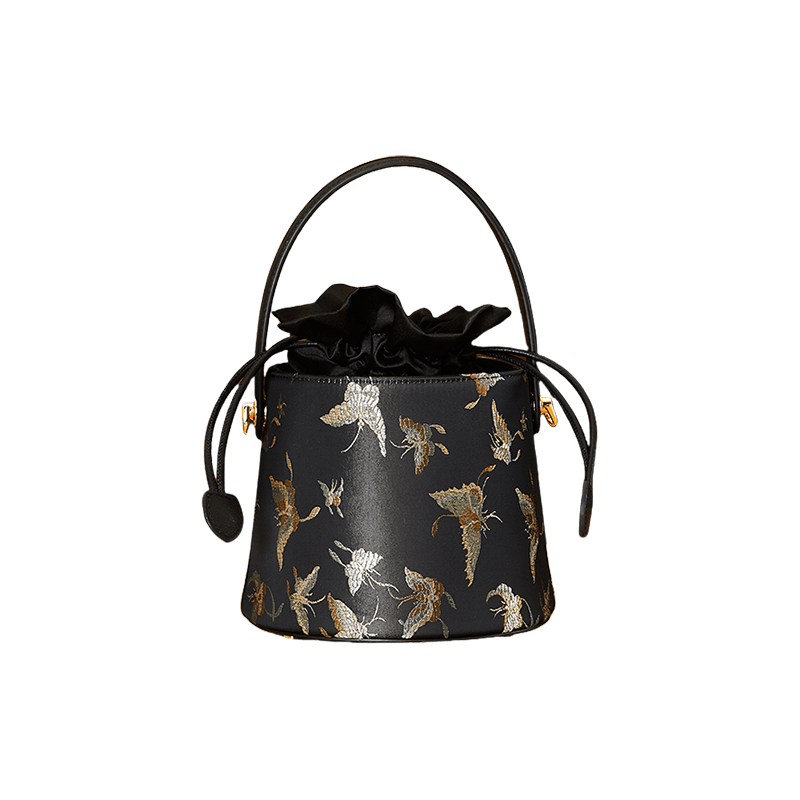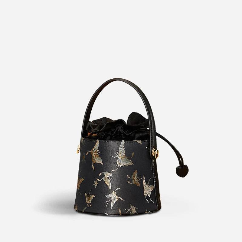 Brocade Black Bucket Bag Designer Butterfly Handbag