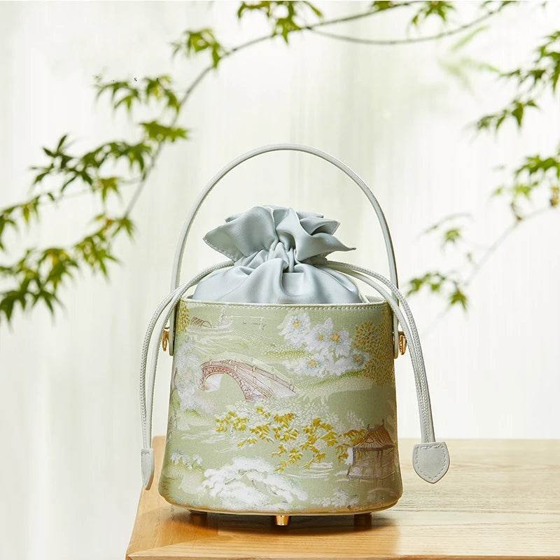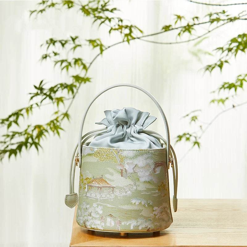 Chinese Painting Mulberry Silk Green Bucket Designer Handbag