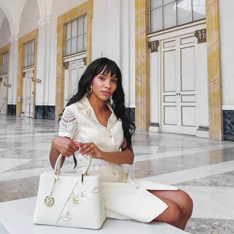 Embroidery Leather Magnolia Tote Bag Elegant Women Handbag with Scarf
