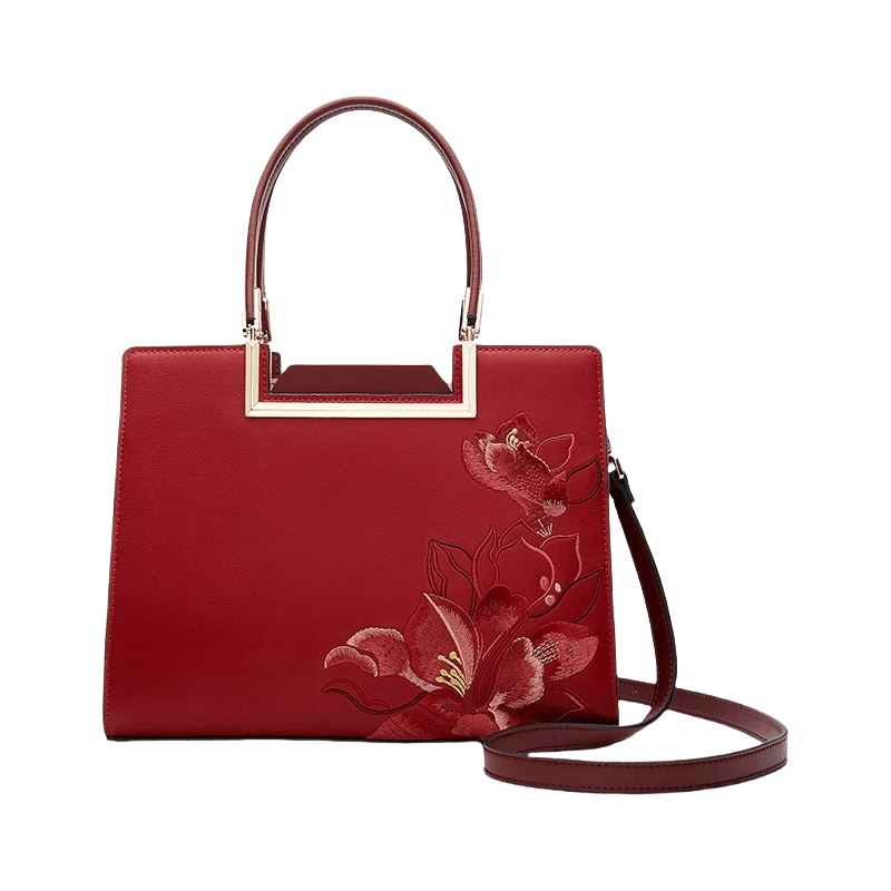 Sinocultural Embroidery Leather Red Tote Bag Magnolia Women’s Handbag