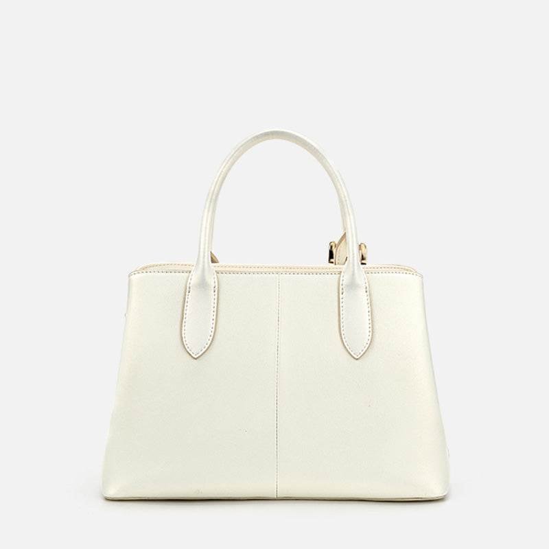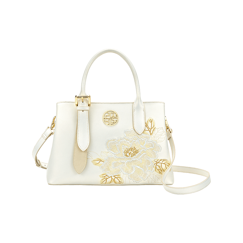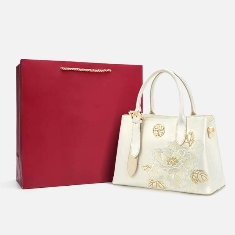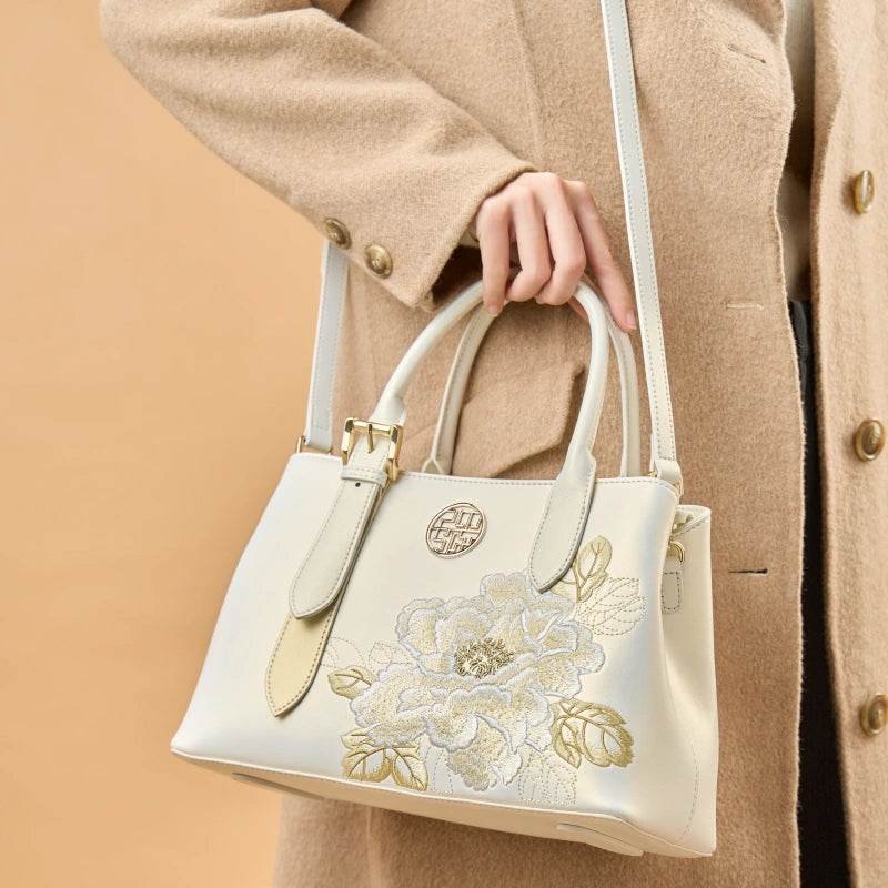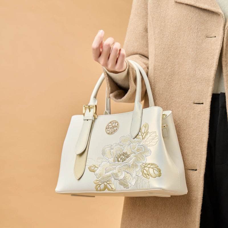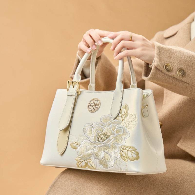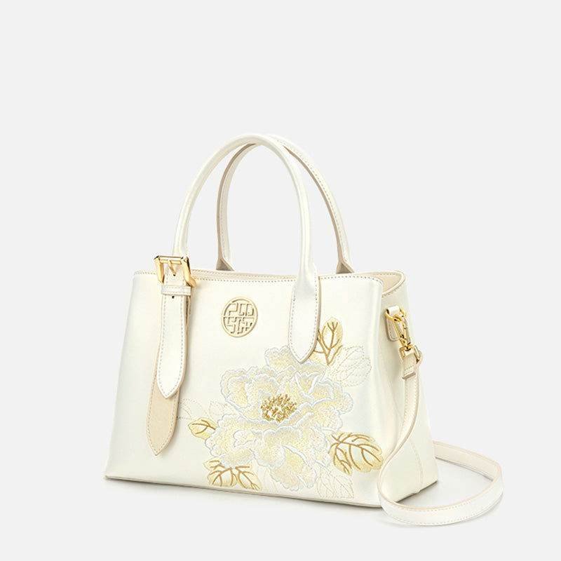 Embroidery Leather Tote Bag White Blooming Peony