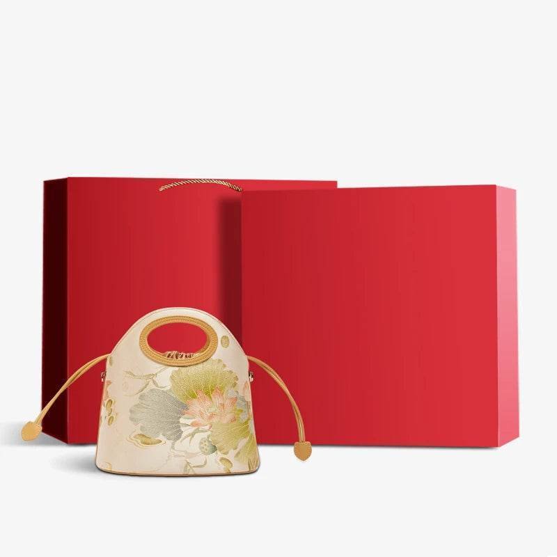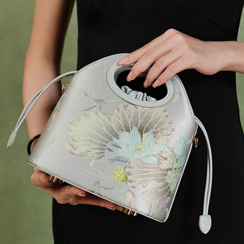 Printed Jacquard Lotus Gray Drawstring Bucket Bag