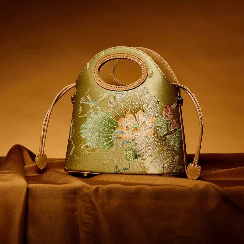 Printed Jacquard Lotus Green Drawstring Bucket Bag
