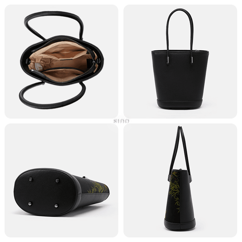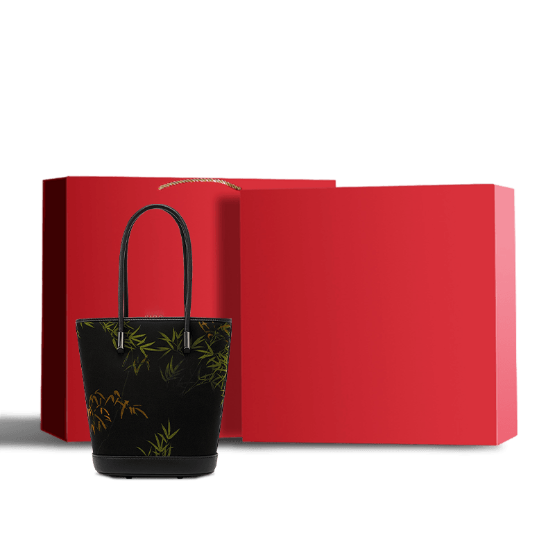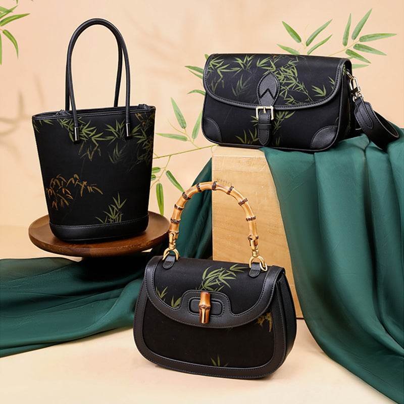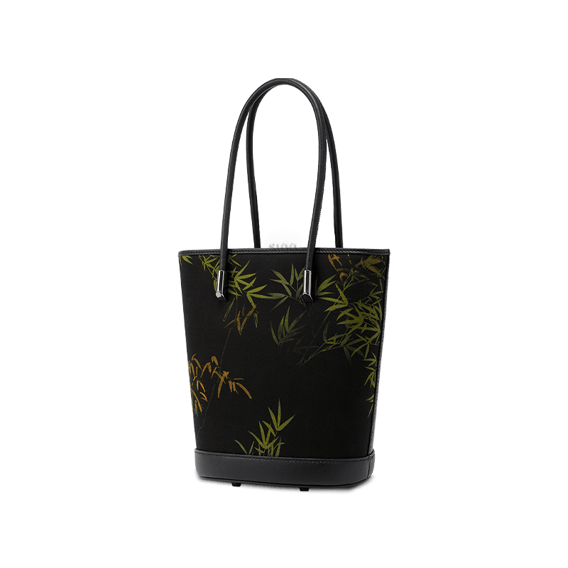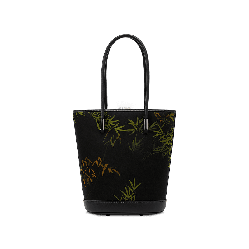 Xiangyunsha Silk Black Bamboo Print Crossbody Bucket Bag