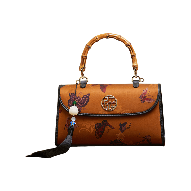 Xiangyunsha Silk Brown Butterfly Bamboo Handle Handbag