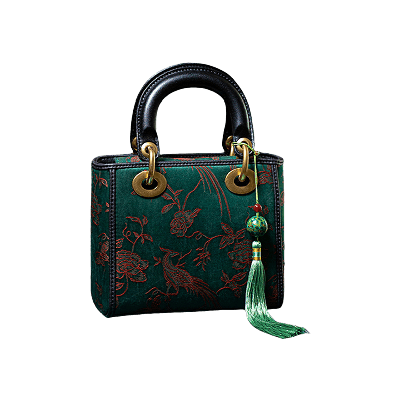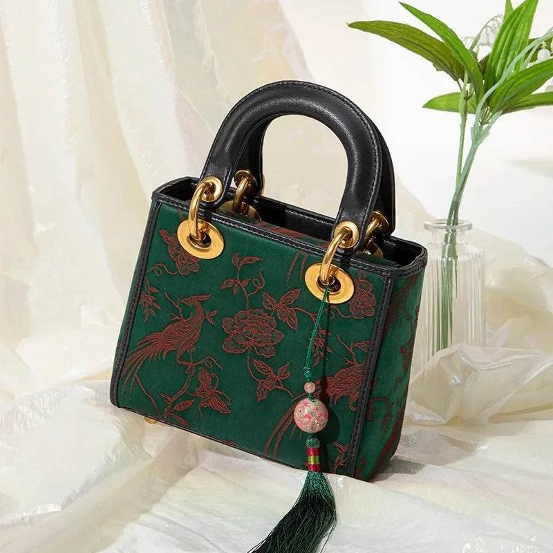 Xiangyunsha Silk Green Retro Cowhide Handbag with Pendant