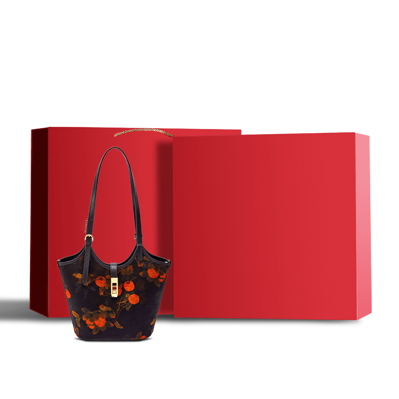 Xiangyunsha Silk Leather Printed Persimmon Bucket Bag